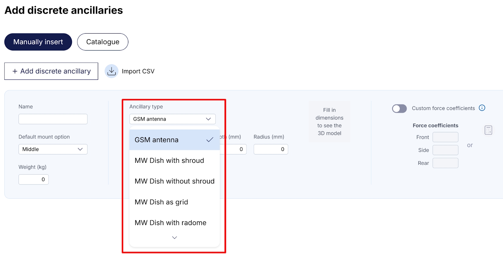 user input - specify directly the force coefficients for Front, Side and Rear of the ancillary