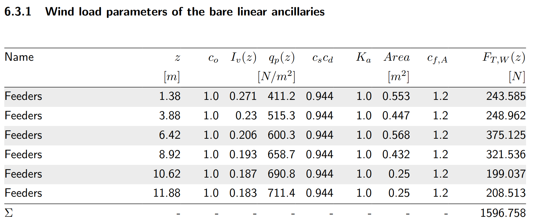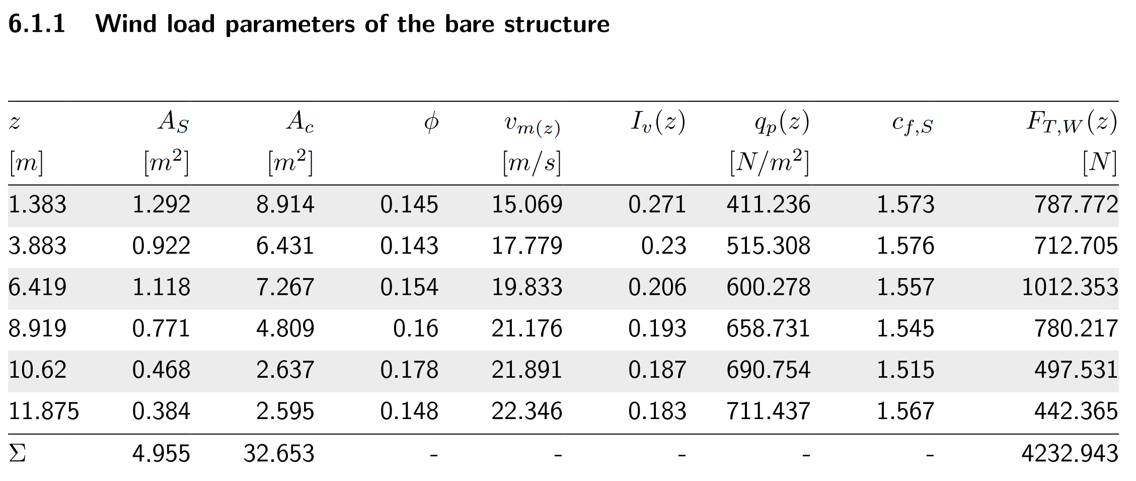 Wind forces on the bare structure extracted from the Shapemaker report are presented below. The "z" column represents the midpoint of each "M" and "K" panel. The wind forces at each "z" elevation along with all the required parameters are calculated automatically.