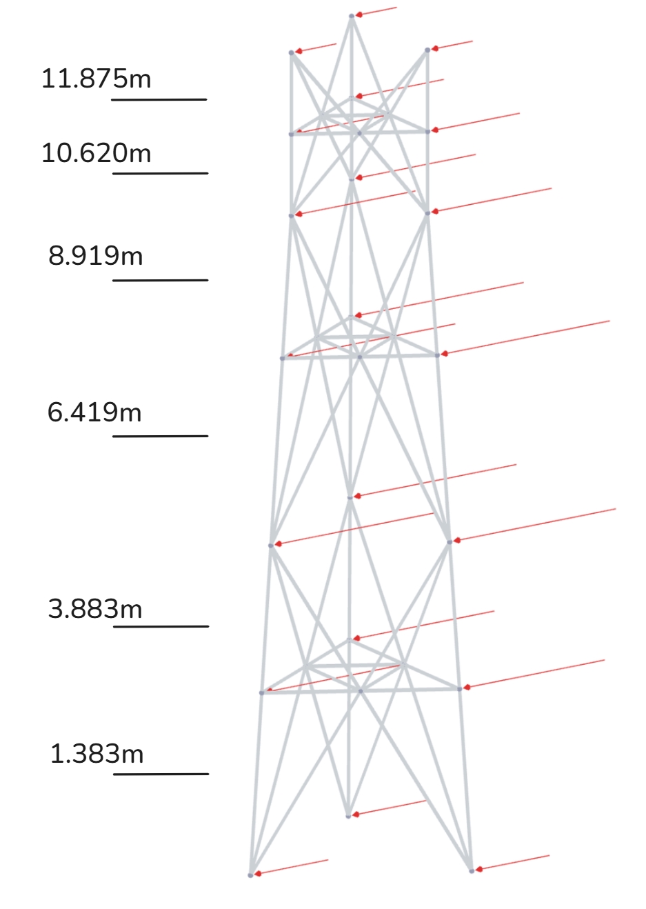 Wind forces are initially generated at the midpoint of each panel and then distributed to all nodes on the legs associated with that panel in the structural model.
