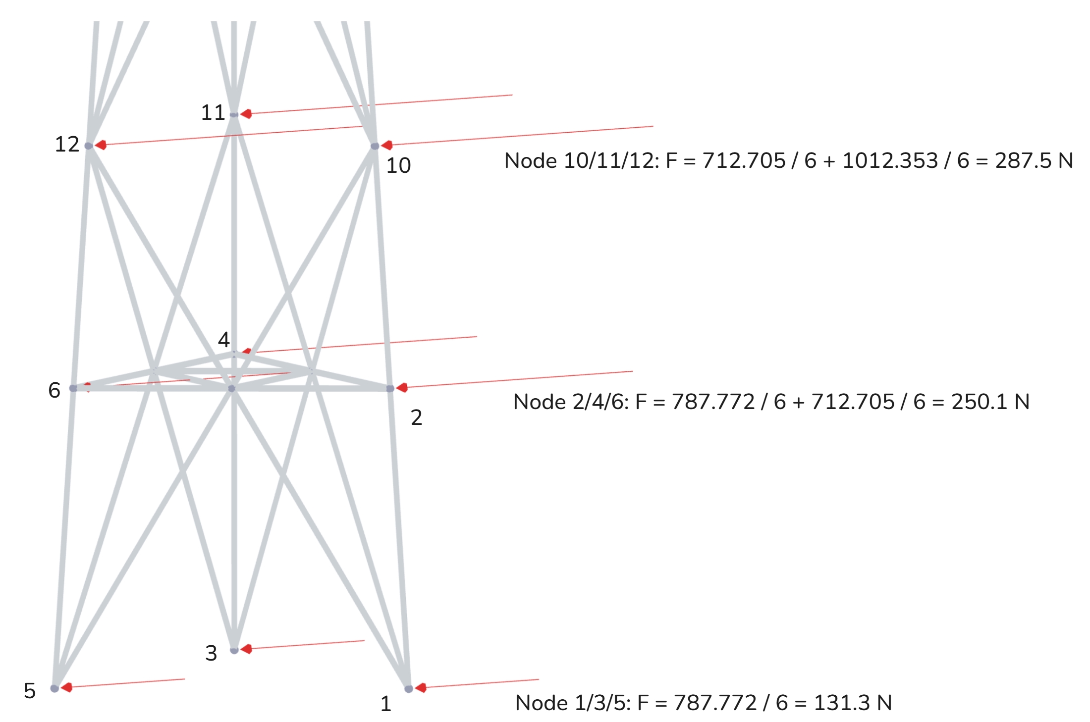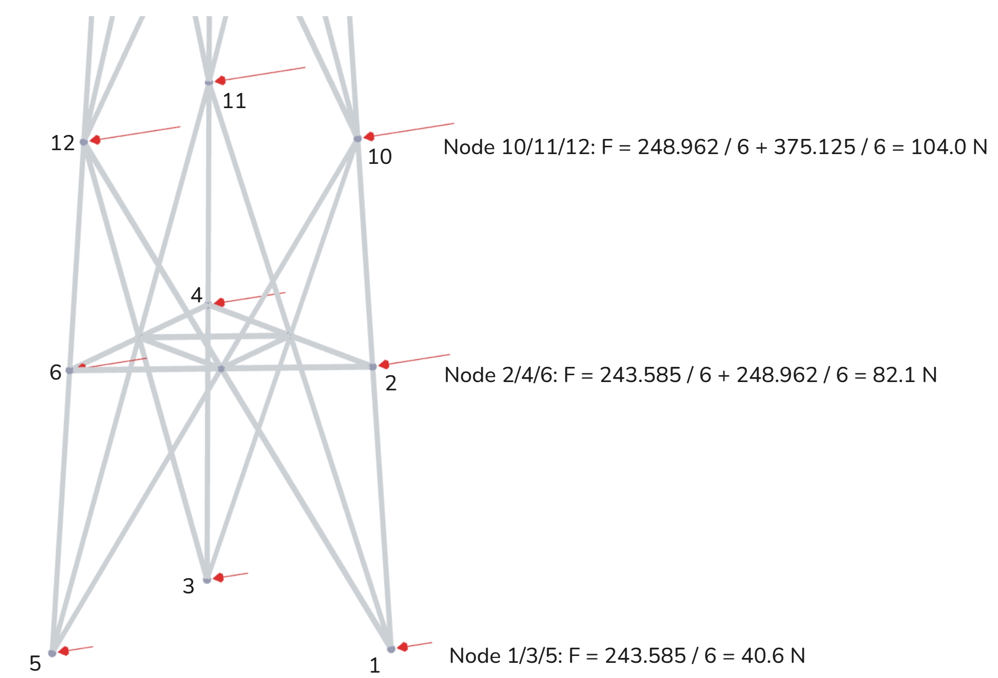 Then, all the forces from the last column are distributed in the same manner as for the structure. The force is divided by 6 (nodes) and summed up with the forces coming from the below and above panels. See the sketch below explaining the process.