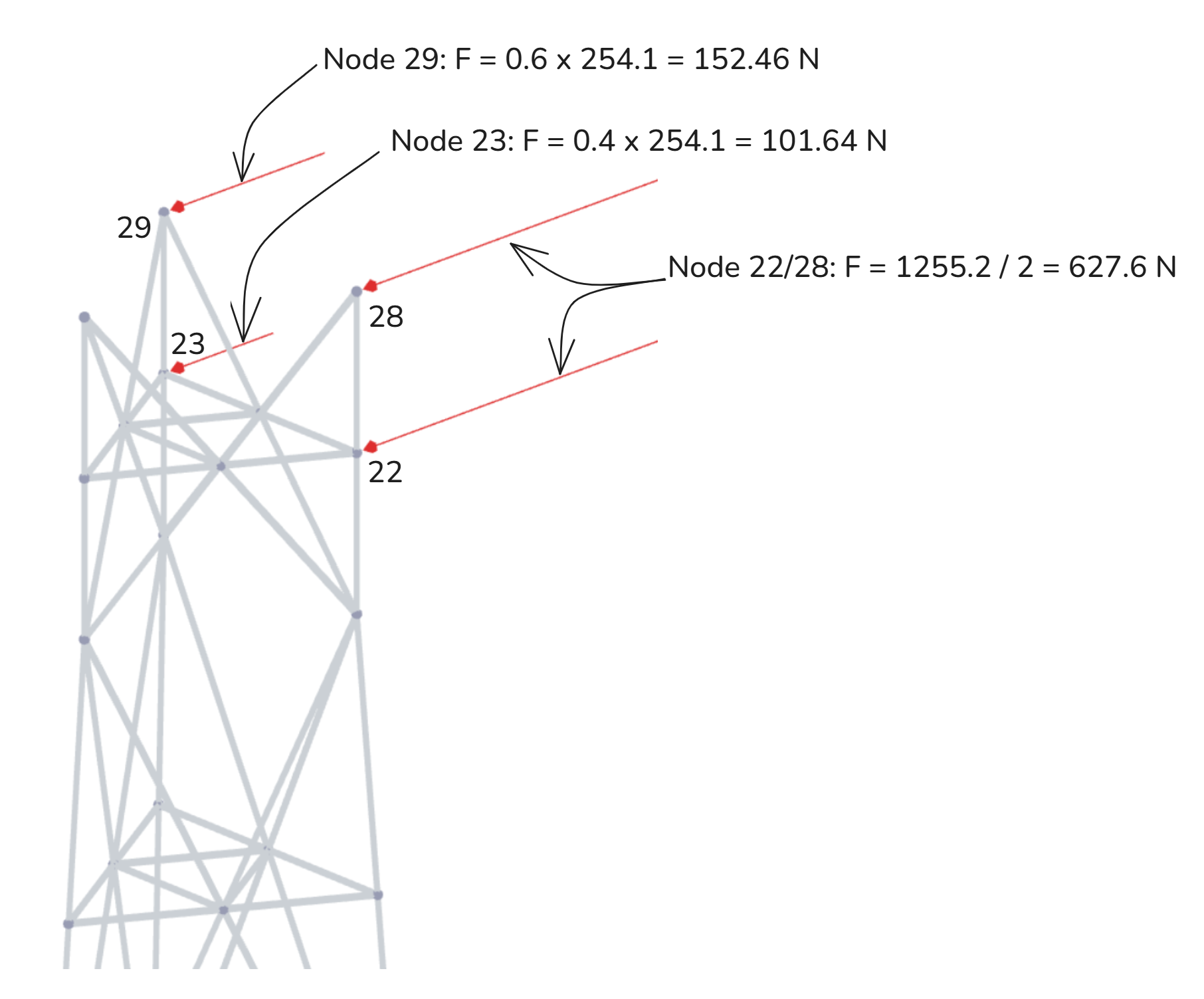 For example, the 1255.2 N force from the Kathrein 800 10403 antenna is distributed between nodes 22 and 28, while the 254.1 N force from the Ericsson AIR 3278 antenna is distributed between nodes 23 and 29. Depending on the antenna's position along the FEA member, some nodes may receive a larger or smaller portion of the total force. In the case of the Ericsson AIR 3278, which is located at 12.0 m, closer to node 29 (12.5 m) than node 23 (11.25 m), node 29 will receive a proportionally greater share of the force.